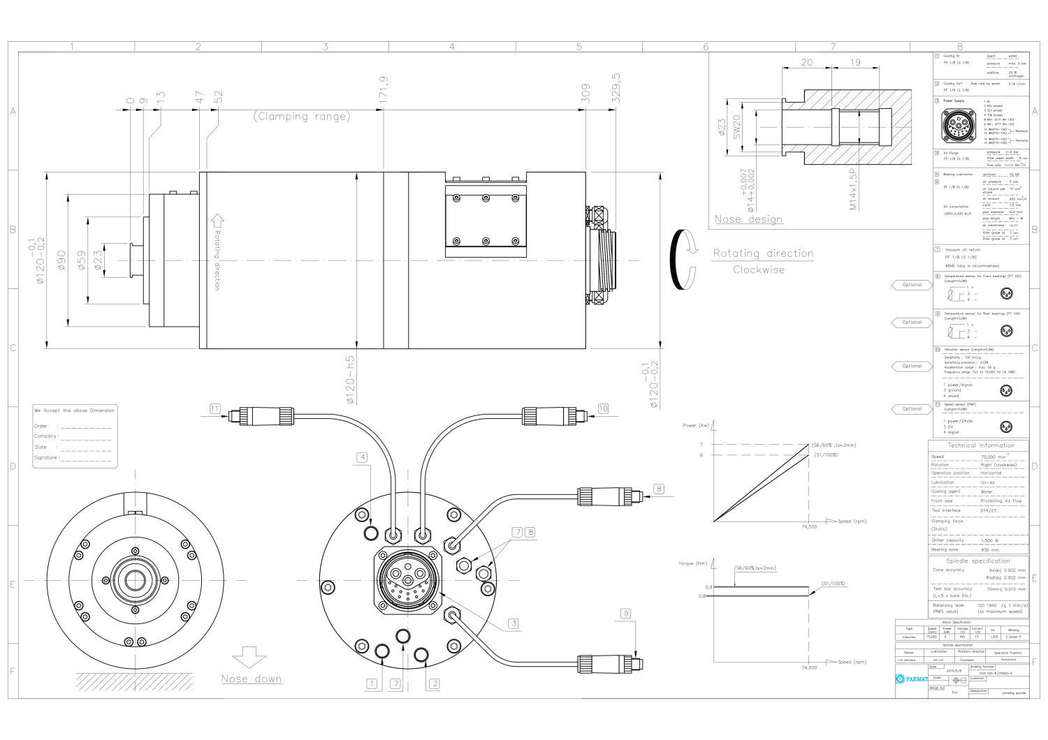 6、獨特設計:特殊結構的氣幕密封+迷宮密封設計使主軸的整體密封效果大大提高,有效的防止切削液和粉塵入侵,使主軸在比較惡劣的工作條件下仍可正常使用,減少密封問題引起的機臺故障,大大提高濕加工磨削環境下主軸的使用壽命。