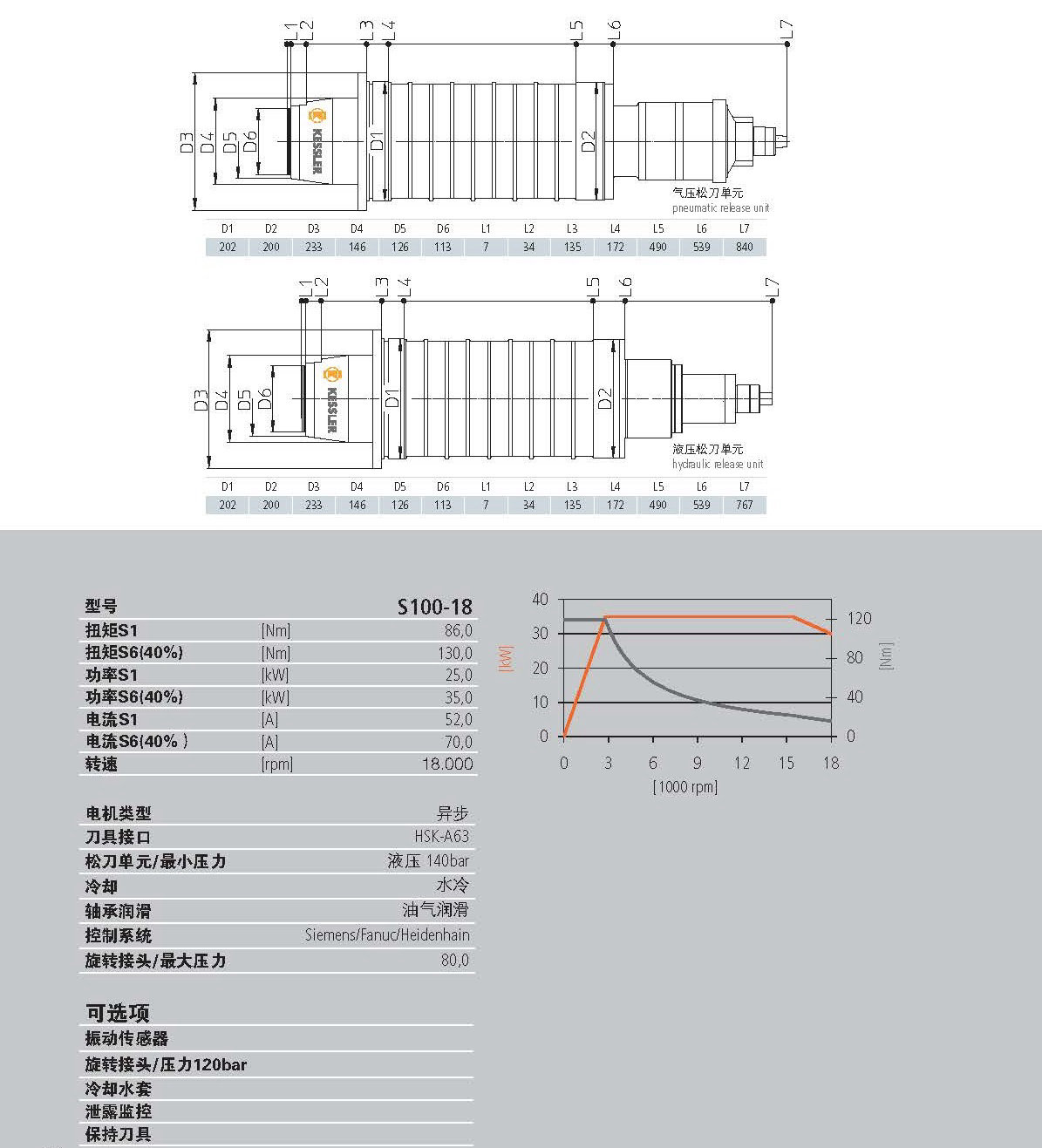 斯勒KESSLER主軸(風冷主軸)高磁弱化、結構緊湊確保了高轉速。可低功率驅動而無需電涌保護裝置。風冷異步電機為切削加工提供了最優性價比的解決方案。