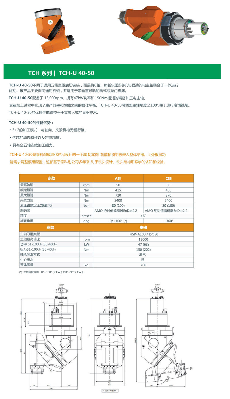 ? ? ? ?TCH-40-50五軸擺頭,最高轉(zhuǎn)速50rpm,額定扭矩415Nm,最大扭矩720Nm,夾緊力矩5400Nm.